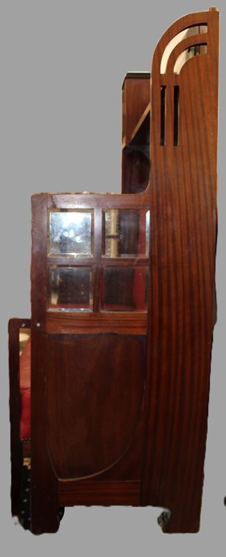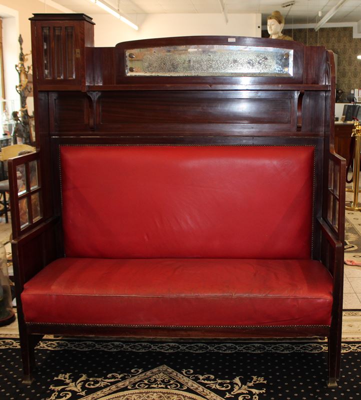 mit Spiegel, verschließbares Fach verglast (Schlüssel fehlt, ist offen), seitliche Lehnen verglast, Beschädigungen/Altersspuren vorhanden, Lehne rechts oben fehlt ein kleines Ornament, 143 x 165 x 58 cm (B x H x T), kein Paketversand!