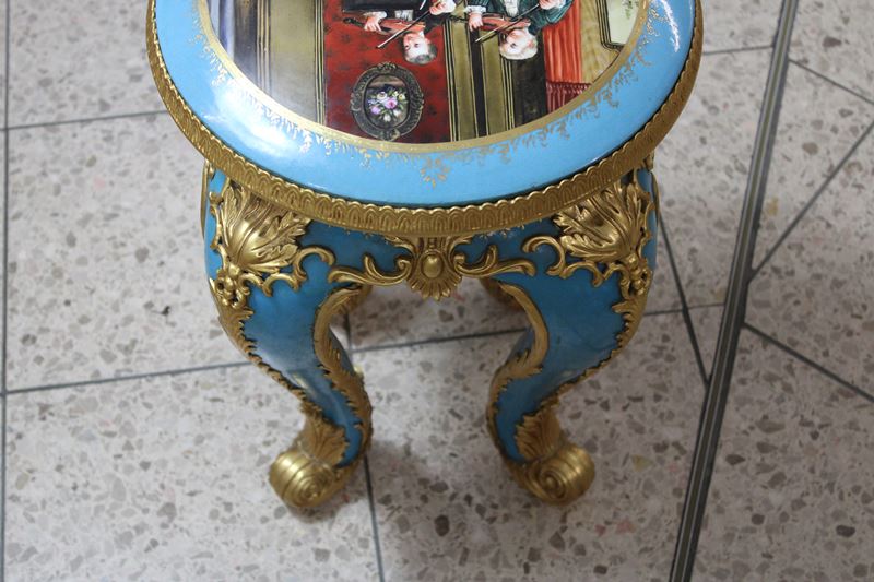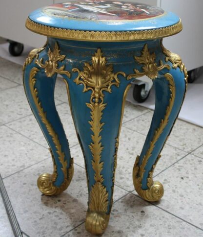 schwerer Metallguss ca. 17,6 kg, Füsse mit aufgelegten Rankenornamenten, Sitzfläche mit Kartusche fein gemalte Rokoko Musikstunde, aufwendige Handarbeit, Höhe ca. 49 cm Ø Sitzfläche ca. 35 cm