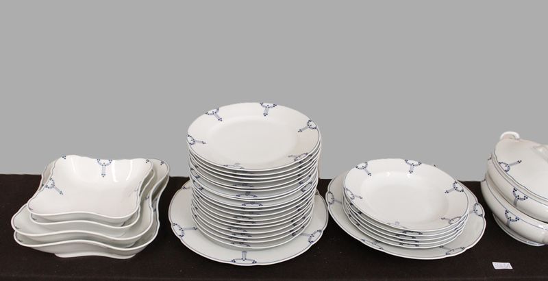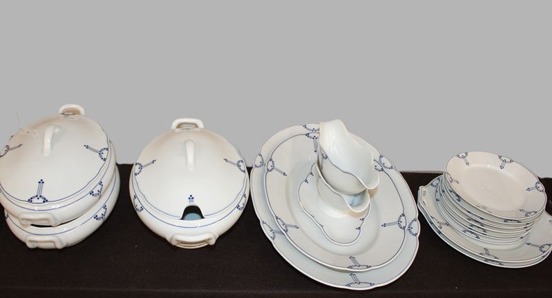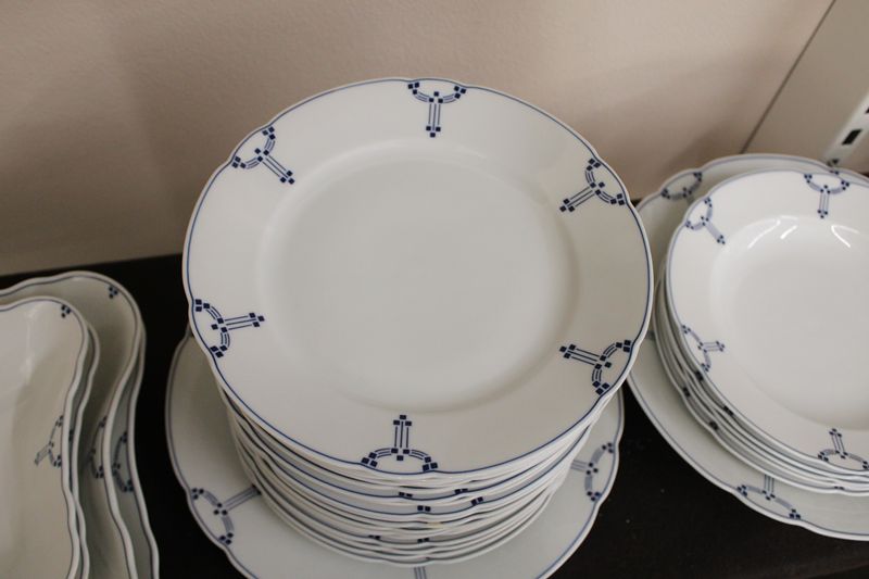 Art Deco Speiseservice mit geometrischen blauen Mustern, tlw. leichte Beschädigungen, 1 Deckel einer Terrine fehlt, eine Sauciere ohne Fuss (abgeschliffen)