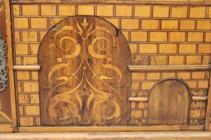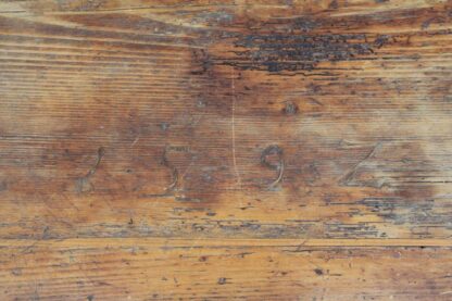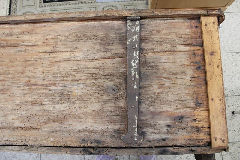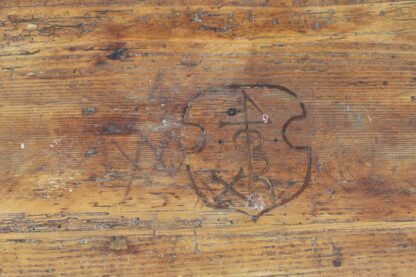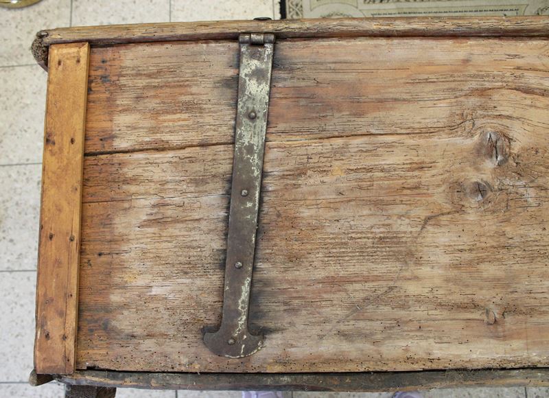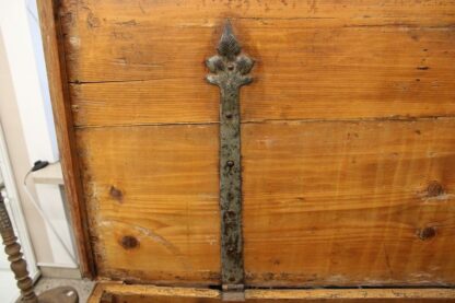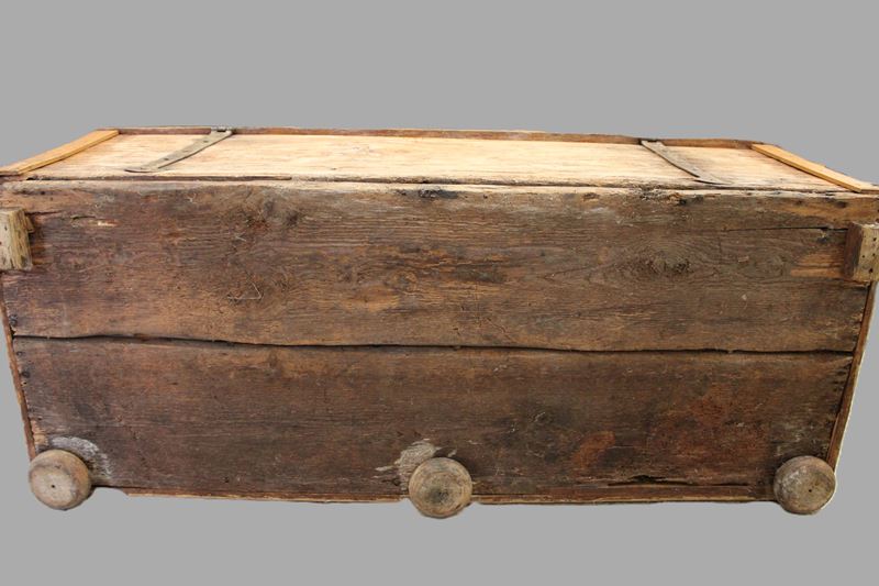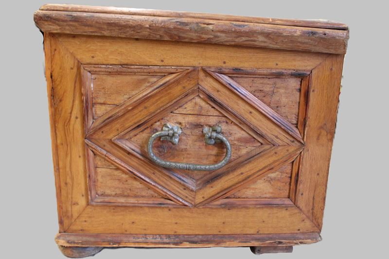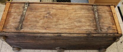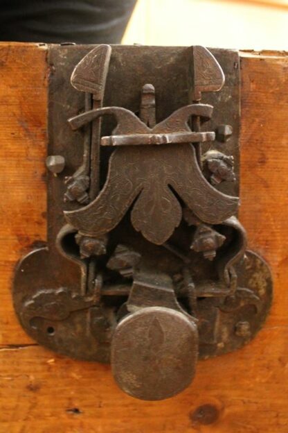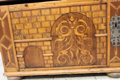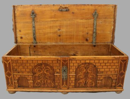 am Deckel re. Datierung 1597 u. li. wohl Herstellerzeichen, Vorderseite mit Intarsien, geschmiedetes Schloss (Schlüssel fehlt), ca. 170 x 66 x 57 cm (L x B x H), Altersspuren/Beschädigungen, kein Paketversand!