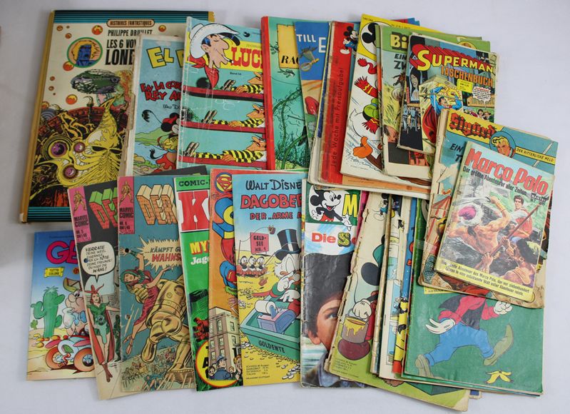 darunter El Raton Mickey En La Corte Del Rey Arturo Walt Disney Ilustracion Sorpresa, Philippe Druillet Les 6 Voyages De Lone Sloane Dargaud Editeur, Tim und Struppi Der Schatz Rackhams Des Roten, Marvel Comic Der Eiserne Nr. 5 u. 6, Kobra Nr. 3, Marvel Comic Die Spinne Nr. 103, Walt Disneys Micky Maus Hefte aus den 50/60/70er Jahren, Bill Der Rote Reiter, Superman, Sigurd etc., viele der Hefte und Bücher weisen starke Beschädigungen auf!