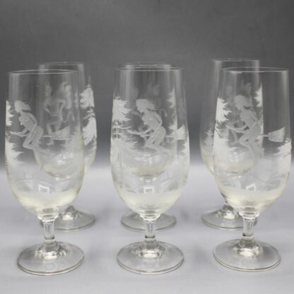 0674-Trinkgläser m. fein gravierten Hexen Teufeln 6 St. ca. 17 cm