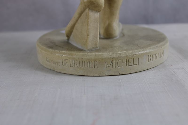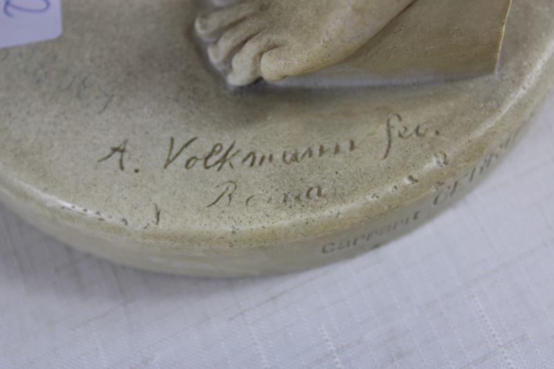Reproduktion hergestellt von Gebrüder Micheli Berlin aus Carrarit (Gussmasse zur Imitation von Carrara-Marmor), im Sockel Rand "Carrarit GEBRÜDER MICHELI BERLIN", oben am Sockel Signatur "A. Volkmann fec. Roma", mehrere geklebte Brüche!, Finger beschädigt, ca. 57 cm