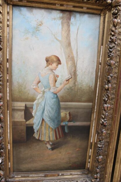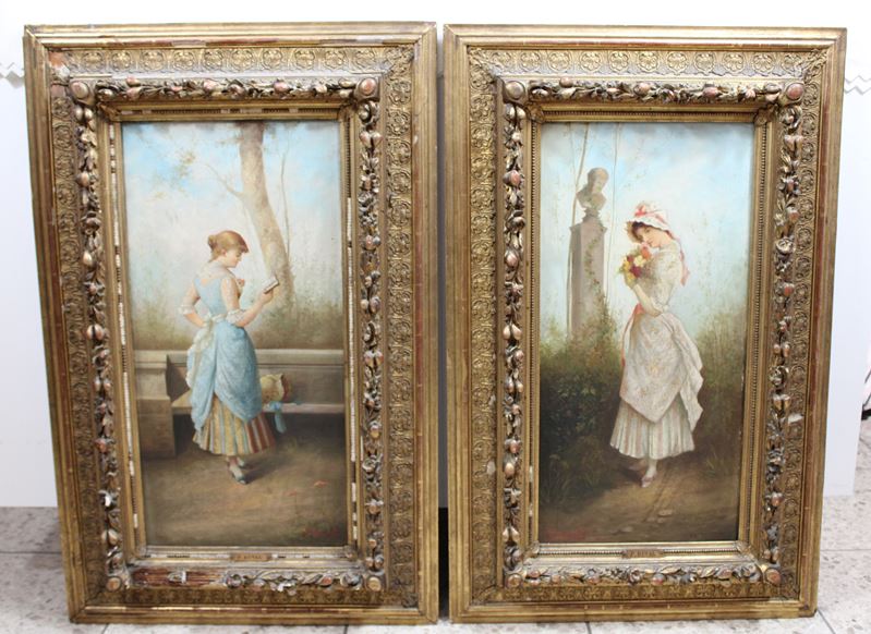 vermutlich nach Originalen von Pierre Duval le Camus gefertigt, Öl auf Leinwand, signiert, rückseitig tlw. bezeichnet "Interessante Lektüre" u. "In der Blütezeit", Rahmen beschädigt, ca. 73 x 47 cm