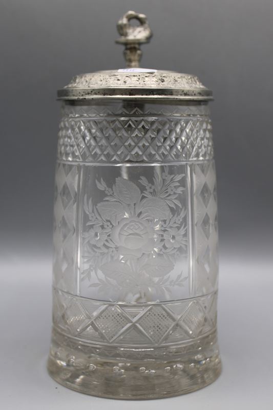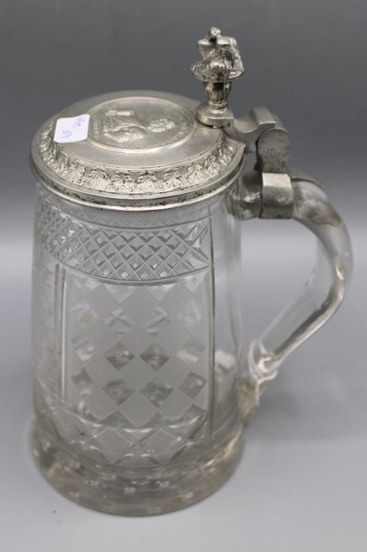 Glaskrug mit Zinndeckel Gambrinus Bay. W. 19 Jh.