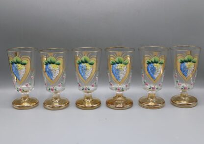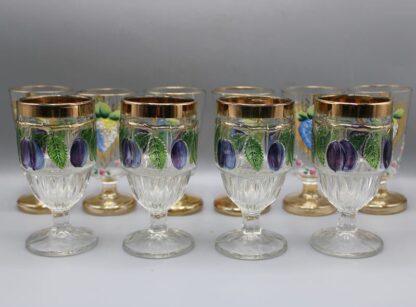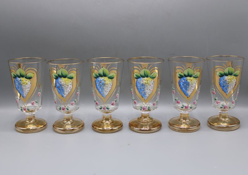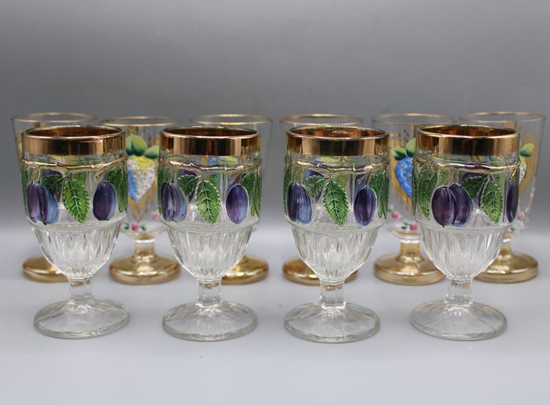 6 x mit floraler Emailmalerei, 4 x Pressglas partiell vergoldet u. mit Pflaumendekor
