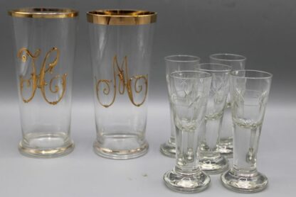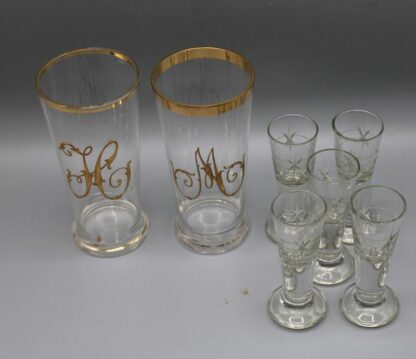 darunter 5 gravierte Schnapsgläser, 2 emaillierte Monogramm Gläser mit Goldrand