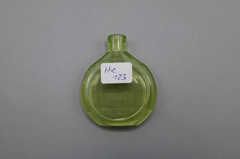 Kleines Schnupfglas Uranglas "Eri Kapelle bei Wiesbaden" ca. 5,3 cm um 1900