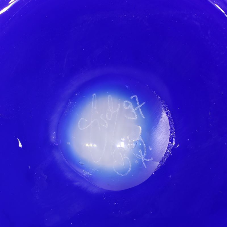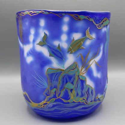 Milchglas blau überfangen, eingeschnittene Seepferdchen u. Fische, bemalt, signiert u. datiert, Höhe ca. 16,5 cm, Ø oben ca. 15 cm