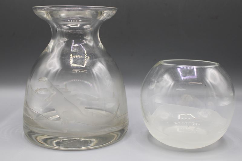 die größere Vase mit einem Dinosaurier graviert u. Monogramm, ca. 8,5 u. 14 cm