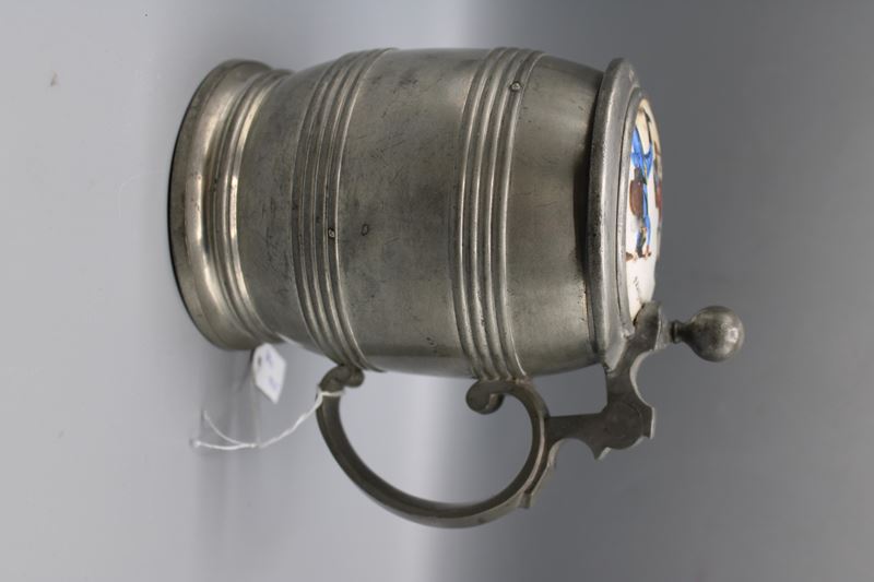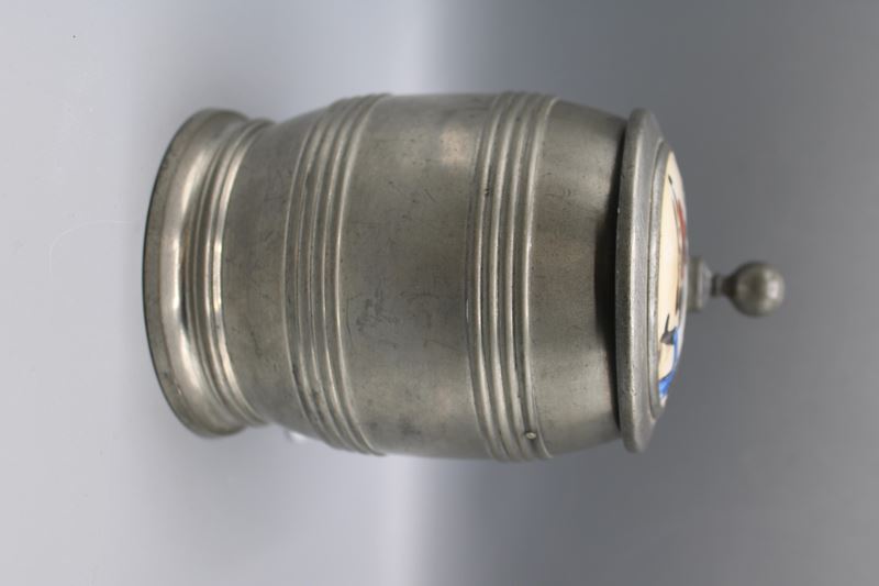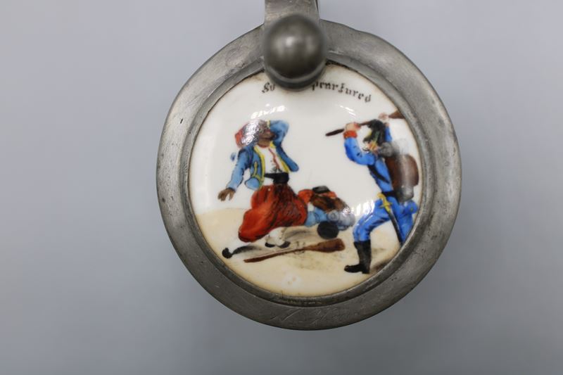 Zinnkrug 1/2 L mit doppelseitiger Porzellanscheibe militärische Darstellung 19 Jh.