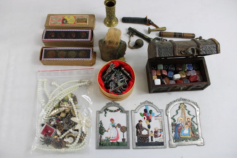darunter Modeschmuck, Uhren (ungetestet), Indianer Zinnfiguren, Laterna Magica Bilder, Hundepfeife und vieles mehr, Beschädigungen und Einzelteile tlw. vorhanden