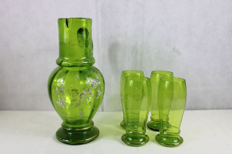 Schenkkanne mit 4 Becher grünes Glas um 1900