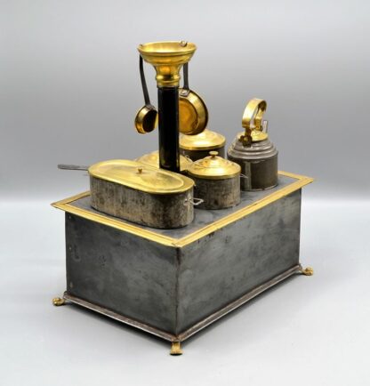 Puppenküche Puppenherd mit Zubehör um 1900, ca. 25 x 18,5 x 12 cm (B x T x H Höhe ohne Kamin)