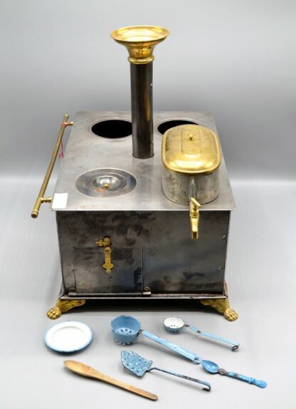 Puppenküche Puppenherd Puppenofen Emaille Geschirr blau um 1900, Brenner mit DRGM 74586, schönes Emaille Geschirr blau ca. 8 Teile, Ofen mit Löwenfüße u. Wasserkessel, ca. 32,5 x 25,5 x 17 cm (B x T x H Höhe ohne Kamin)