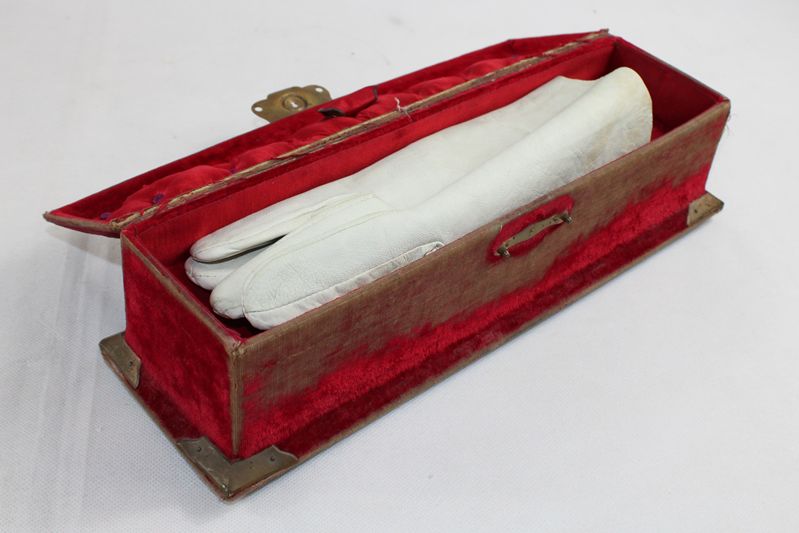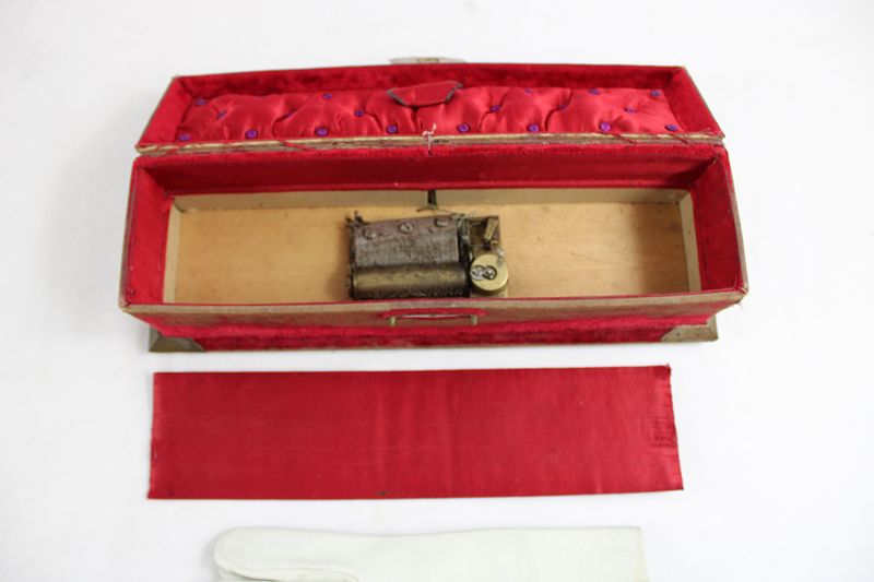 die Spieluhr läuft beim Öffnen des Deckels an (Aufzugschlüssel fehlt!), ein Fuß ersetzt, deutliche Altersspuren/Beschädigungen, ca. 33 cm, mit weißen Lederhandschuhen