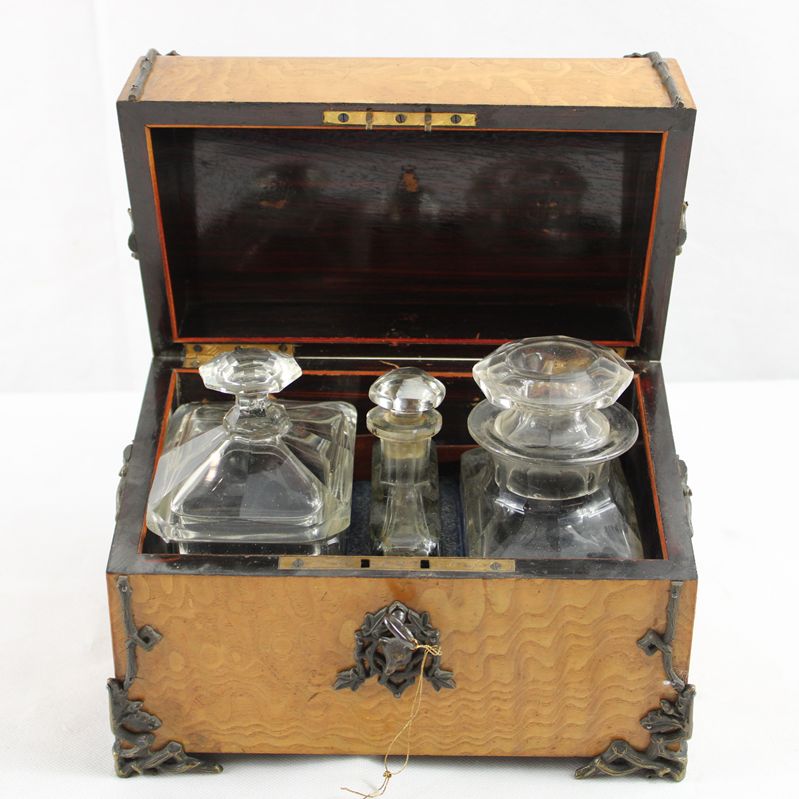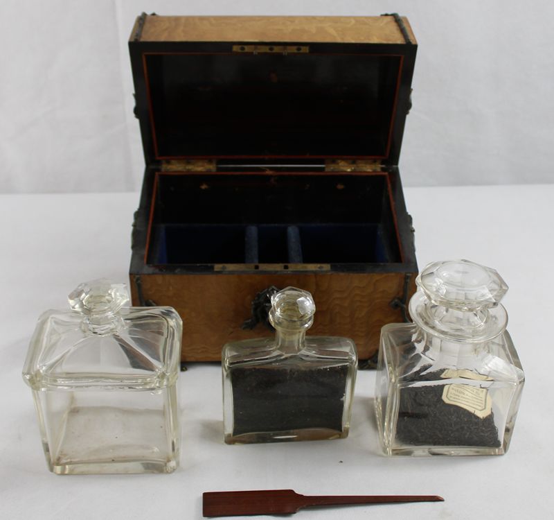 mit reichen Bronzeapplikationen (1 etwas locker), 3 Glasbehälter für Tee wohl später ergänzt, da sich der Deckel nicht schließen lässt Glasbehälter minimal zu hoch (1 Glasdeckel beschädigt), Schloss funktioniert, ca. 24 x 14,5 x 18,5 cm