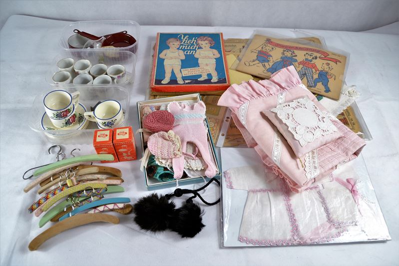 Puppenstube Puppengeschirr Puppenkleidung etc. Konvolut, darunter Puppengeschirr Porzellan, 2 Emaille Geschirr, kleines Besteck, Puppen Kleiderbügel, Puppenkleidung u. Bettwäsche etc..., Beschädigungen können vorhanden sein