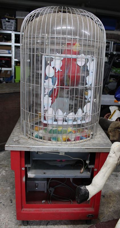 Hersteller Automaten Limburg Nederland B.V., 50 Cent Einwurf laut Schild, der Papagei sollte sprechen und sich bewegen können, Funktion ungetestet (vom Elektrofachmann vor Benutzung prüfen lassen), hintere Blechabdeckung fehlt, ca. 133 x 61 x 54 cm (H x B x T), Altersspuren/Verschmutzungen, kein Paketversand!