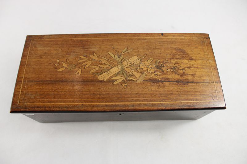 Deckel intarsiert, 6 Melodien, spielfähig (Einzelfunktionen, Spieldauer etc. nicht geprüft), Schlüssel fehlt, Altersspuren, ca. 42 cm