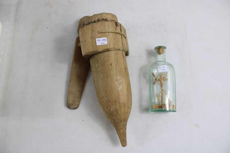 0813-Wetzstein Kumpf aus Holz und kleine Eingerichtflasche Konvolut