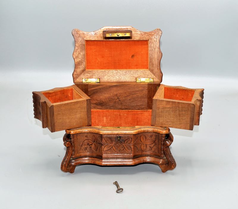 0824-Schmuckschatulle Holzschatulle Waldvogel geschnitzt um 1900