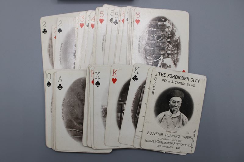 Pekin & Chinese Views, Copyright 1901 by Grimes-Stassforth Stationery Co. Los Angeles, vollständiges Spiel mit 52 Karten und 2 weitere Karten mit Herstellerangaben und Bezeichnung der Abbildungen, Altersspuren, 1 Karte (Prominent Views) mit Knick