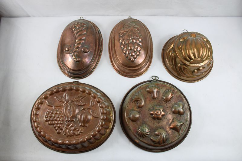 Kupfer Backformen mit Motiven 5 St. 19/20 Jh.