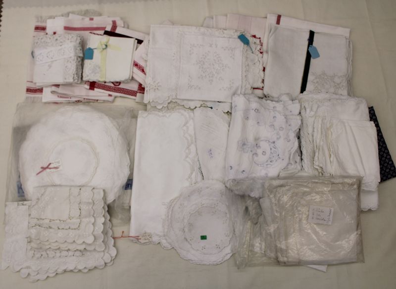 viele gute Zustände, tlw. Monogramme, viele mit Beschriftungen wie Küchenhandtuch Messertuch etc., vereinzelt Flecken/Verfärbungen