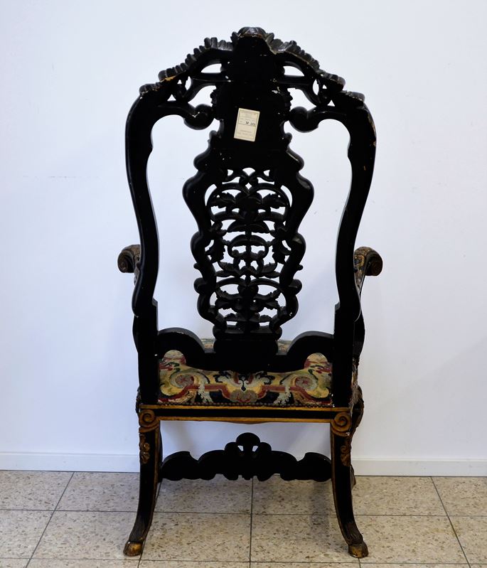 Prunksessel Thron Historismus 19 Jhdt., mit reichem Schnitzdekor Rocaillen Voluten Akanthusranken florale Ornamente etc., glatte Flächen ebonisiert zur Hervorhebung der Ornamentik, bestickte Sitzfläche, geschnitzte Tierfüsse, Gesamthöhe ca. 142 cm, Sitzhöhe ca. 52 cm, Sitzbreite vorne ca. 69 cm, Sitztiefe ca. 48 cm, vereinzelt Farbabplatzer