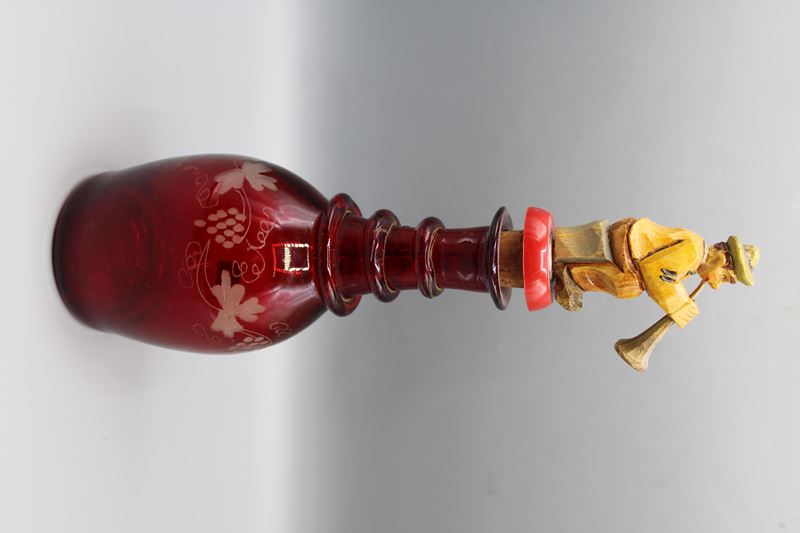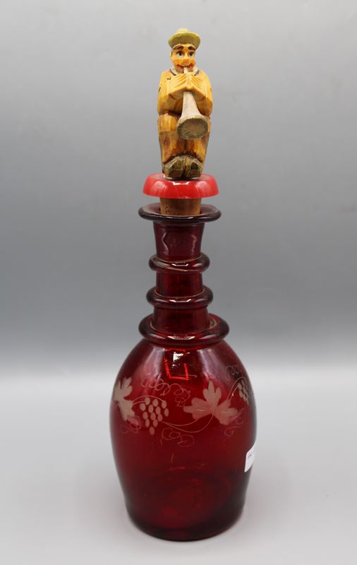 0877-Glaskaraffe rubinfarben mit Musikanten Verschluss Böhmen 2. H. 19 Jh.