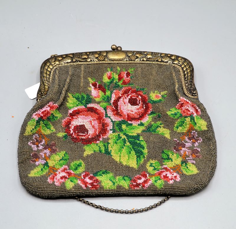 0888-Perlenbeutel Perlentasche Rosen Blumendekor Verschluss vers. um 1900
