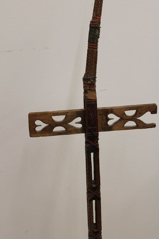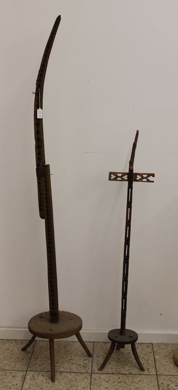 wohl Holzständer für das Rohmaterial von Spinnrädern, Holz geschnitzt, der große Ständer mit kleinem eingelegten Heiligenbild, ca. 162 u. 112 cm, bei dem kleineren Ständer ist die Spitze gebrochen, kein Paketversand!