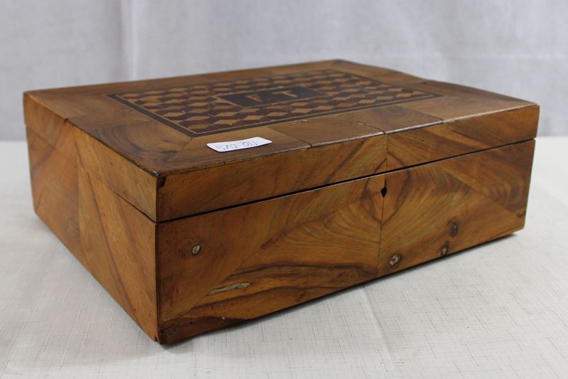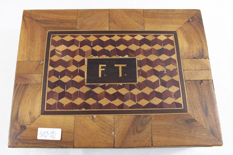 mit Einlegearbeit, Monogramm "F.T.", ca. 32 x 24 x 11 cm, Altersspuren, Schloss fehlt