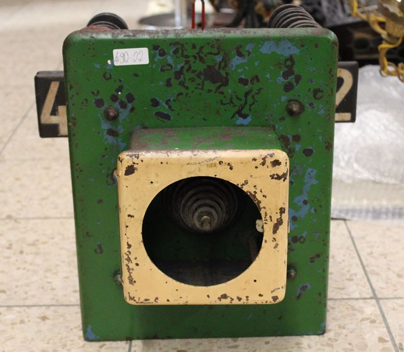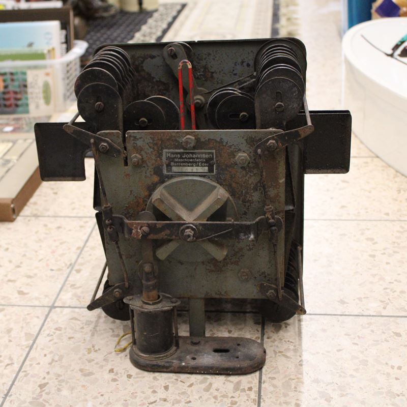 Herstellerschild rückseitig "Hans Johannsen Maschinenfabrik Battenberg/Eder", früher elektrischer Scheibenautomat mit Trefferanzeige für Schützenvereine oder Schiessbuden, Klapptüre zur Einlage von Scheiben mit ca. 15 x 15 cm, Funktion ungetestet (vom Fachmann prüfen lassen), Altersspuren und Beschädigungen, Restaurationsobjekt, ca. 36 x 29 x 34 cm (H x B x T)