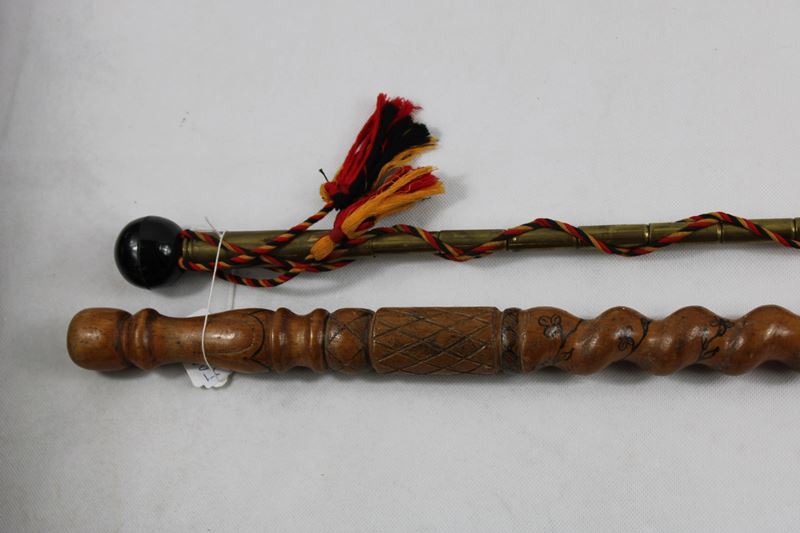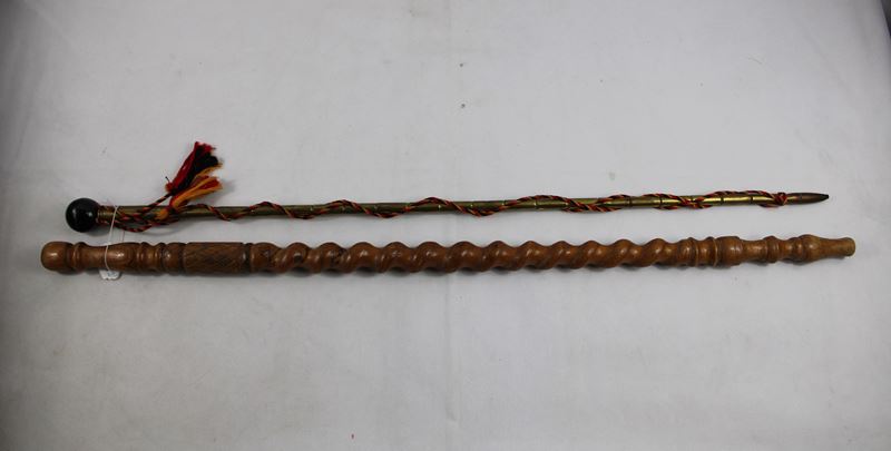 einer davon aus Patronenhülsen gefertigt ca. 86 cm, der andere Holz geschnitzt/gedrechselt ca. 89 cm