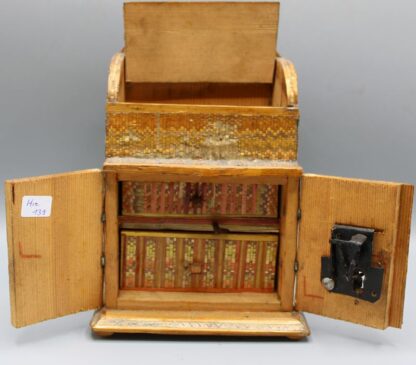 feine Strohintarsien, oben Klappfach, unten 2-türig, innen 2 kleine Schübe, handgeschmiedetes Miniatur Schloss (Schlüssel fehlt), ca. 19 x 13 x 9,5 cm