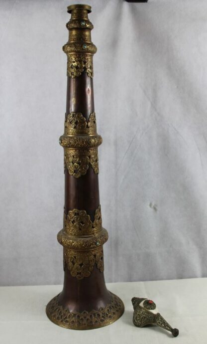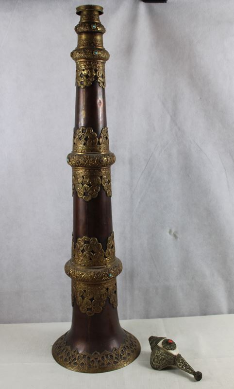 Tempeltrompete aus Kupfer verziert mit Messingornamenten u. Ziersteinen, ausziehbar, 75 cm u. 184 cm (ausgezogen), Muschelhorn ca. 15 cm