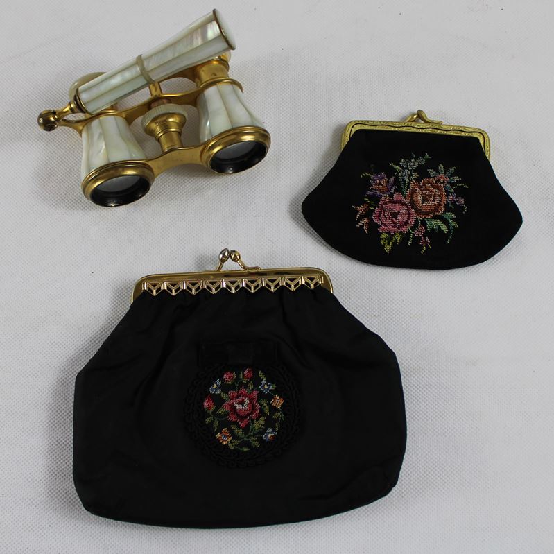 Perlmutt Opernglas u. 2 kl. bestickte Täschchen Konvolut