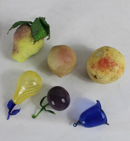 Altes Deko Obst Konvolut 5-teilig, tlw. Glas mundgeblasen, dazu 1 Glas Blüte